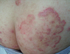 二、股癣:好发于腹股沟部位,也常见于臀部,单侧或双侧发生。基本皮损与体癣相同。由于患处透气性差、潮湿、易摩擦,常使皮损炎症明显,瘙痒明显。